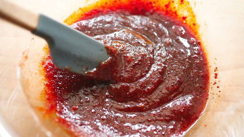 - To make the tteokbokki sauce, mix together the gochujang, 1 teaspoon gochugaru, soy sauce, and sugar in a small bowl. Set aside.