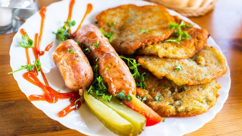 For all the varieties of potato pancake around the world, though, boxty has the unique distinction of using both shredded and mashed potatoes. According to 196 Flavors, boxty traces its roots Irish province of Ulster and counties Fermanagh, Leitrim, and Donegal, among others. It's commonly served with smoked salmon, sour cream, sausages, fried eggs, bacon, lamb chops, and even the notorious Irish beef stew. Boxty is regularly eaten at breakfast, but it's really a food you can enjoy any time of day. It's just that good.