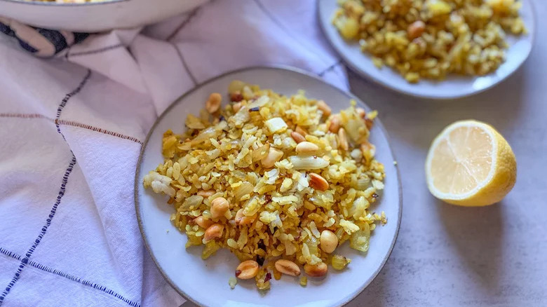 It might be difficult for us to imagine having rice for breakfast, but it is standard fare in different parts of the world. Kanda Poha, which the Love of Spice says came from the Indian state of Maharashtra, is one such dish. Poha is rich which, per Tarladalal is rich which has been "parboiled, rolled, flattened and then dried to produce flakes" which come in varying degrees of thickness. This version of kanda poha includes peanuts and spices for a light meal or filling snack.