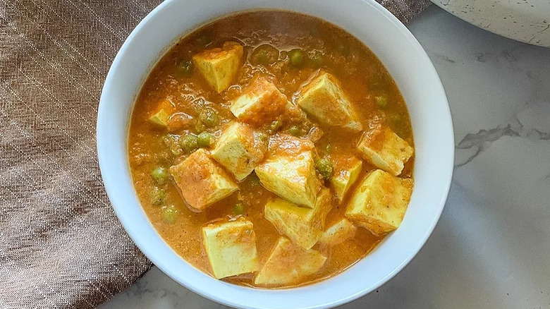 Paneer is a classic ingredient in Indian cuisine, which Sukhis states dates back to the 16th century, and to the country's Persian and Afghan conquerors. The ingredient is a type of Indian cheese, which most cooks make at home. It is then used in many different ways and is widely served with a spicy gravy like this mater paneer, which is flavored with tomatoes, heavy cream, as well as a traditional Indian spice combination.