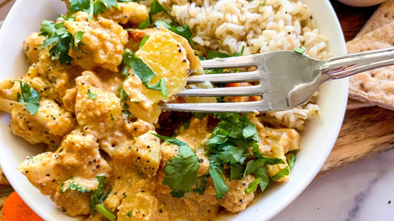 Kormas exist in different variations across different parts of India and can be made with just about anything from meat and poultry to vegetables, per MasterClass. This flavorful dish makes use of a much more straightforward blend of spices than its Indian cousins, and it leans into coconut milk in place of yogurt, to deliver a braised, Indian-style treat vegetarian treat. And if you're craving meat to go with your korma, Table Agent states that a vegetable korma would do well as a side dish.