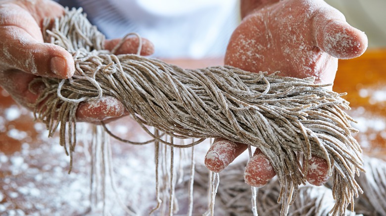 As "Korean Cold Noodle Rhapsody" reveals, most mul naengmyeon is made with buckwheat noodles. These noodles are different from soba in that they are taut and very chewy. They're made with buckwheat flour, which is often combined with wheat starch to create that signature elasticity. The gluten-free dough is pressed into a noodle-making machine, which extrudes the strands into boiling water. The cooking time for these noodles must be around 80 seconds, lest the noodles become a clumpy mess or too al dente, per Koryo Group. Once boiled, they should be shocked in cold water and rinsed three times.