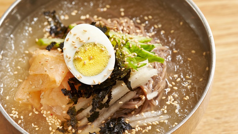 "Cold noodles" is a phrase that evokes different dishes for different diners. Maybe you think of your favorite summer picnic pasta salad recipe or an Asian-inspired dish with crunchy vegetables that you love to douse in peanut sauce. One especially unique cold noodle dish goes beyond the threshold of refrigerated pasta: It's so cold that it has ice in it. It's called mul naengmyeon, and it satisfies a craving for the cold crunch of a slushie, while also pleasing your palate with savory flavors. Thin and chewy buckwheat noodles bathed in an icy beef broth and topped with fresh cucumber and hard-boiled egg, mul naengmyeon is a Korean summer classic.