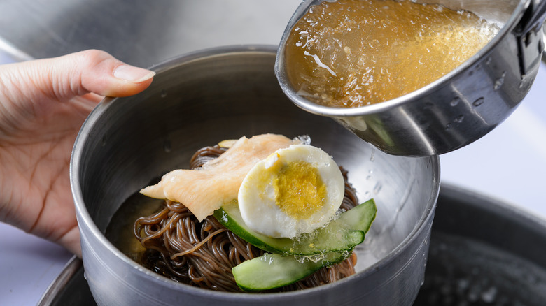 Preparing the mul naengmyeon broth is a whole other process that usually requires hours and even days to make. Most Korean restaurants serve naengmyeon in beef broth, but some use a mixture of chicken, beef, and pork to add a more interesting flavor (via NPR). They add their own radish kimchi brine or dongchimi to the beef broth, which introduces a uniquely sweet and refreshing flavor. The naengmyeon soup is frozen — or at the very least, chilled in the fridge — so that the noodles can be served very cold.