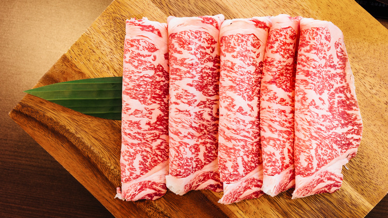 Real Wagyu beef comes from cattle unique to Japan (the name literally means "Japanese cow"), which are specially bred for their unique fatty musculature, per Business Insider. Because their fat is more evenly dispersed within the muscle tissue, Wagyu is especially tender and rich. This is partially achieved by feeding the cows a specialty, energy-dense diet, sometimes incorporating unusual foods like dried olive peels. The entire cattle-raising process is strictly regulated by the Japanese government, and if their standards aren't met, the meat won't be certified for market. So how can you ensure you're getting real Wagyu, with the official seal of approval? Look for these signs.
