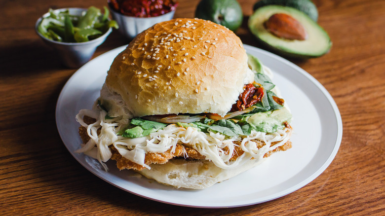 Now let's talk about what goes on special bread to complete the sandwich. The Daily Meal notes that Cemita Milanesa de Pollos can be made with many different types of meat, but it's typical to use milanesa, meat that's been pounded, breaded, and fried. The meat is topped with queso Oaxaca, shredded by hand, string cheese-style into a pile of fine white strands (via Serious Eats). There are typically onions, as well as jalepeños, which may be pickled or smoked and dried to make chipotle peppers, also included in the torta.