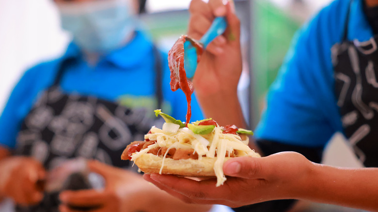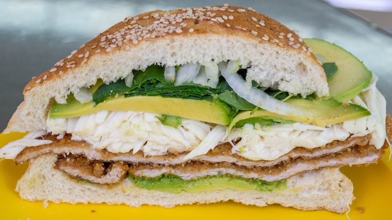 According to Eater, the name "cemita" actually refers to the kind of bread this sandwich is served on, differentiating it from other types of tortas. It is a round roll made from a dough with lots of eggs, similar to the dough used for brioche, and the top is coated in sesame seeds. Serious Eats notes that many American vendors use a typical soft sesame bun like you'd get with a hamburger, but Puebla-style cemita bread should have a soft crumb with a crunchy exterior — and it should taste just slightly sweet.