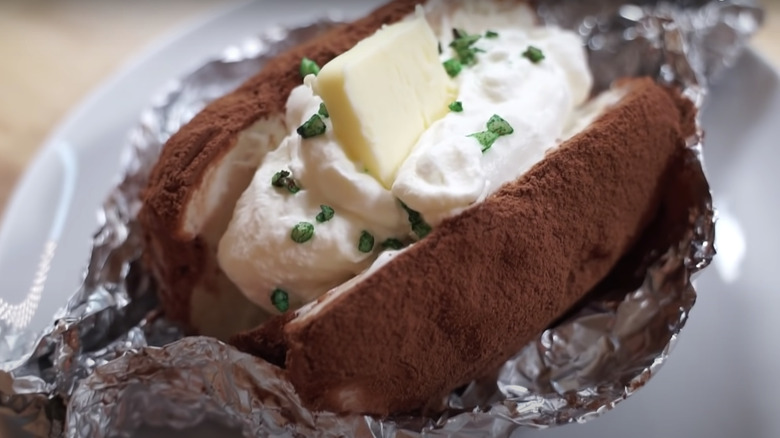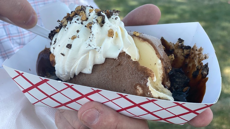 The "fake out" food category of foods that look like other foods is actually a pretty expansive one, and few mediums seem to take to it better than ice cream. After all, who doesn't remember chowing down on a Choco Taco with its folded sugar cone filled with chocolate-swirled vanilla ice cream that resembled a taco (via Klondike)? In Germany, a traditional fake-out ice cream is the spaghettieis sundae, in which vanilla ice cream is passed through a ricer in order to make "noodles," then topped with strawberry sauce to look like a plate of spaghetti with tomato sauce (via International Desserts Blog). And in the U.S., you may have come across a frozen dessert called the ice cream potato, which does its darnedest — and often succeeds — to masquerade as a baked potato piled with sour cream.