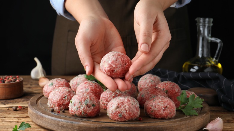 One of the biggest mistakes you can make is to shape them incorrectly. According to Kitchn, a well-made meatball needs to be tender and juicy. You shouldn't need a knife to cut through it. It should be well-formed enough that it won't fall apart while cooking and won't be a brick of meat when it's served. One thing you might need to do in order to make the perfect meatballs is to stop overmixing your meat. Overhandling ground beef can cause it to bind up, and ruin the texture. Another thing to avoid is packing your meatballs too tightly. You want your meat to be gently bound together. Meatballs have the added benefit of ingredients like eggs and breadcrumbs to help them stick together and don't need to be packed together like a snowball to keep their shape. Luckily, there are a few ways to easily avoid these mistakes.