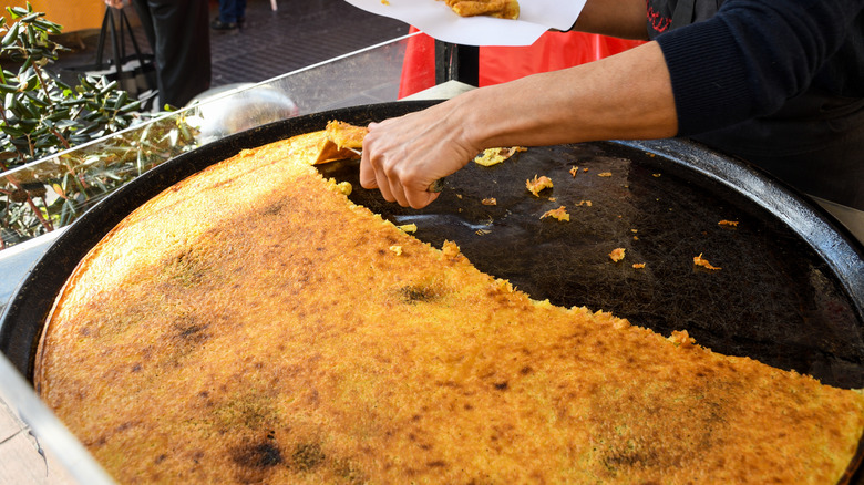 In Nice, the famed chickpea-based street food is called socca, which is a cross between a pancake and flatbread, according to The People's Friend. The ingredients needed to make socca are simple: all you need is chickpea flour, olive oil, and water. Once the batter is prepared, it is poured into a shallow pan and baked in a hot oven until it becomes golden and crispy. Traditionally, socca is made in a copper pan over a fire, per My Recipes. Once done, the socca is then sprinkled with black pepper and then cut into bite-sized pieces to enjoy on the spot — usually while walking around and enjoying the open-air markets of France.