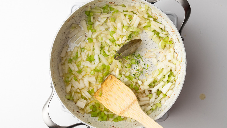 - Add the diced onion, celery, and garlic to the pan, along with the bay leaf and the stalks of thyme. Cook for 10 minutes until the onion and celery is translucent and soft.