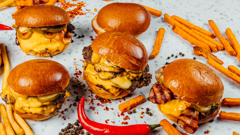 For the uninitiated, Our Modern Kitchen explains that a smash burger is a hamburger patty that has been pressed down onto a ripping hot griddle to cook in its own juices. This style of burger has always been popular at burger shops like In-N-Out Burger and Shake Shack, but it's seen a resurgence in recent years in standalone restaurants (via Eater). Most places are using patties that are pared down to one to three ounces, smashing them on griddles, then serving them up quickly to hungry customers.