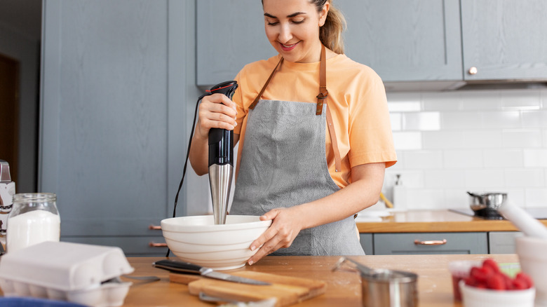So the next time you make scrambled eggs, try pulling out your immersion blender in lieu of a whisk. It doesn't take much time to make a huge difference. With this appliance in your scrambled egg-making arsenal, you'll keep your mornings everything but scrambled — and put perfectly fluffy eggs on your plate.