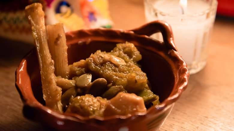 Calabaza en Tacha is most commonly served around the Día de los Muertos (Day of the Dead) celebrations, which run from October 30 to November 2. This holiday is dedicated to honoring and celebrating loved ones that have passed on. Not only is this dish eaten in Mexican households, but it is often placed on traditional altars. These altars can be decorated with photographs and personal mementos, but food items are also commonly added (via Mexican Made Meatless).