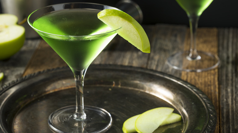 Bright green appletinis were listed on menus at French bistros and Applebee's restaurants alike in the late '90s: vodka, Sour Apple Pucker, lemon juice, and Cointreau resulted in a neon drink that arrived at tables garnished with apple slices or maraschino cherries in a classic martini glass (via Punch Drink).