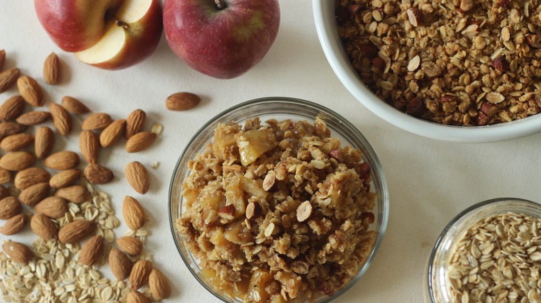 When making a fruit crumble, you're looking for a contrast between the crisp, firm, crunchy streusel topping and the soft layer of apple underneath. According to the New York Times, pre-baking your topping is one way to ensure it does not become a sloppy mess when you add the apples underneath. All you have to do is spread the topping on a sheet pan and bake for a little bit until golden brown and crunchy. Then, layer the crumble topping on top of your apple crisp when you're ready to bake. You'll find much more crunch when you bite into the crisp and intensely satisfying contrast between the layers. You can choose to freeze the topping if you make too much ahead of time. But for optimal crispiness? We recommend pre-baking your crisp the day of and enjoying your crunchy layered dessert as soon as possible.