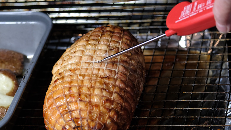 To take a proper internal temperature, be sure to insert the meat thermometer at the thickest portion of the meat, without hitting bone or gristle. The thermometer will need to sit about half an inch into the meat to ensure that it is in the middle. After getting a temperature reading, clean the thermometer well with warm soapy water before probing the meat again to prevent the transfer of foodborne illness from raw to cooked meat.