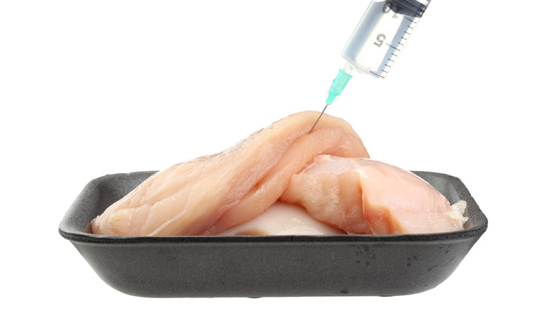 The process of "plumping" poultry has been around since the 1970s (via LA Times). Chicken, and some other meats, are injected with a saltwater solution — and oftentimes other natural flavors such as broth, sugar, seaweed, or concentrate — to enhance flavor, add moisture, and tenderize the meat. These injections can make up to 15% of the meat.