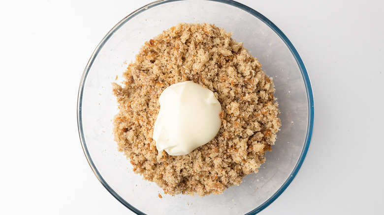 - Cool the cake completely, then crumble it until it resembles breadcrumbs.