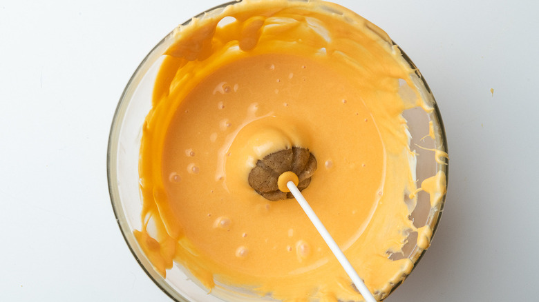Melt the chocolate, either in a microwave or a pan, but remember to stir it frequently to ensure that it won't scorch. As soon as the chocolate has melted, stir in a few drops of food coloring — the exact number will depend on the brand you use and just how orange you want your cake pops to be.