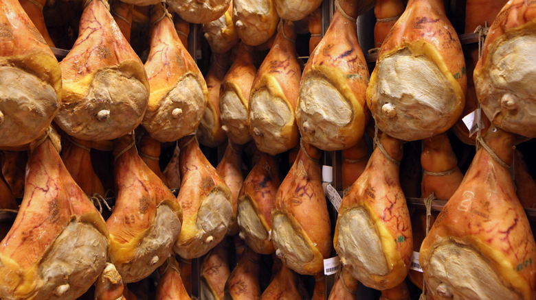 We have the early Romans to thank for prosciutto crudo (the uncooked kind, popular in the U.S.) when they discovered dry-aging would preserve the meat through the winter (via Farming Aquaponics). The leg is salted, which pulls the blood and moisture out of the meat to keep it safe from bacterial growth, and left for 90 days in a cold, humid area. Translated from Latin, prosciutto means to "suck out moisture" (via Cucina Toscana). Once cured, the salt is washed off and the leg is hung where air can circulate around it for at least a year.