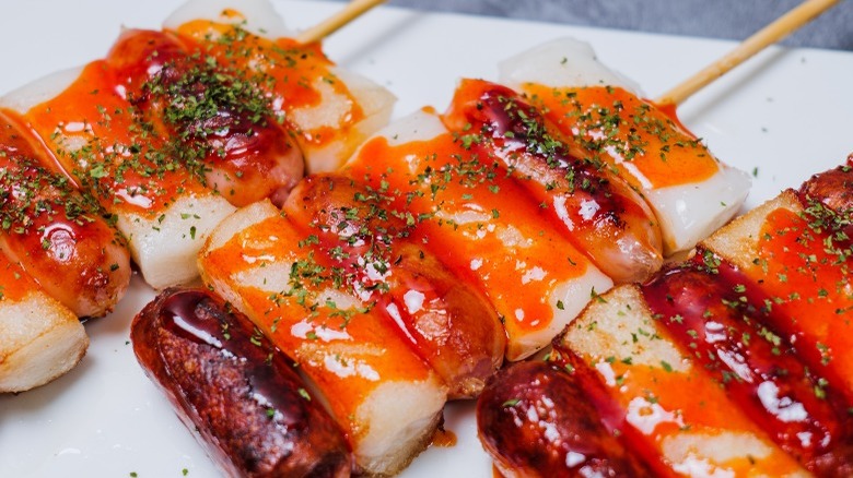 If you're not making the tteok yourself, you'll need to rehydrate it. Frozen garaetteok can be hard and dry if not soaked. My Korean Kitchen recommends soaking them in warm water for about 10 minutes before boiling them. Once you have rehydrated your tteok and scored your mini-sausages, begin assembling on bamboo skewers. Start by piercing each tteok and sausage through the middle, sliding them onto skewers in an alternating pattern. Then baste with its signature sauce (a combination of Korean gochujang, soy sauce, ketchup, and honey or brown sugar) before pan-frying until the sausages and rice cakes are crispy on the outside and chewy-tender inside. Popular Korean influencers Aaron and Claire recommend using your air fryer for a quick and delicious hack (via YouTube).