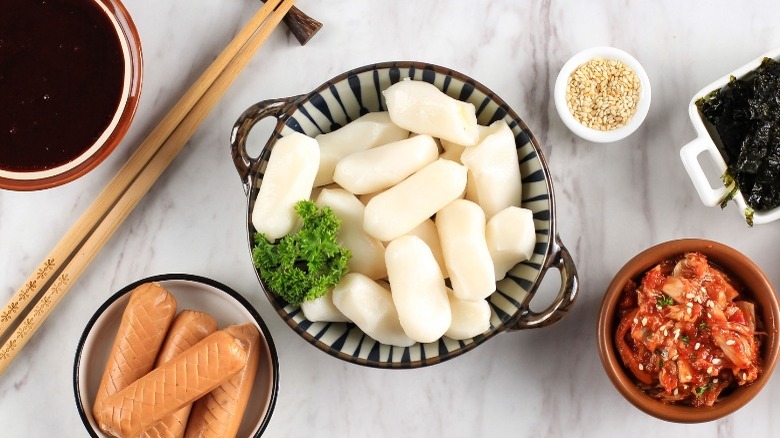 If you're making sotteok sotteok in the comfort of your own kitchen, your biggest obstacle may be getting two of its three main ingredients: garaetteok and gochujang. Both can easily be found in Asian markets, but no problem if you don't have access to where you live. Amazon carries both and even has a couple of gluten-free versions of the sauce available. If you're feeling adventurous, you can make your fresh garaetteok in about 25 minutes, according to cookbook author and Saveur-ranked food blogger Sue Pressey at My Korean Kitchen. All it takes is wet-milled rice flour, corn starch, salt, water, and sesame oil.