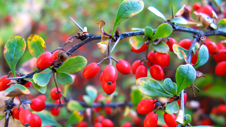 When you look up images of the barberry, you'll stumble across pictures of bright, small, garnet-colored berries hanging from a branch with sharp thorns. Their leaves can be a variety of colors from green to yellow, orange, and red, and they grow all over the globe today. Masterclass says there are four common barberry plants: European barberry, Japanese barberry, American barberry, and Oregon grape. The European barberry (Berberis vulgaris) is the fruit variety most commonly used in Iranian cuisine, whereas the Japanese barberry (Berberis thunbergii) is most often used ornamentally. Barberries are eaten raw, dried, mixed into savory and sweet dishes, and even squeezed into syrups, jellies, and candies.