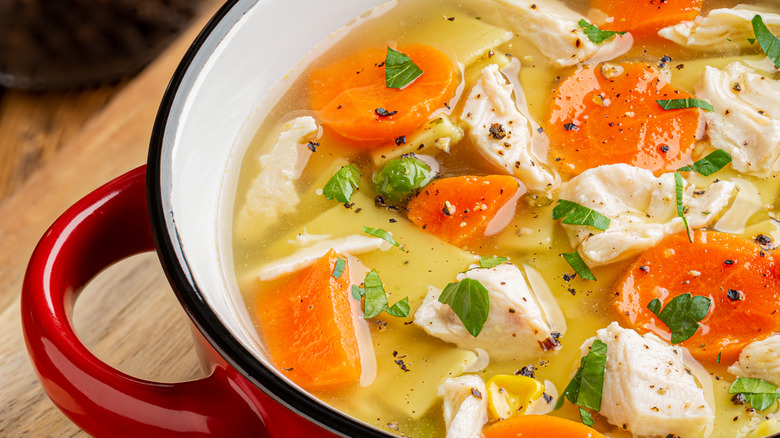 However, chicken noodle soup is more effective when homemade than canned, and it's best to add vegetables toward the end of the cooking process to maximize their nutritional benefits (via Discover Magazine). According to BBC Good Food, chicken soup provides healthy, easy-to-consume calories, making it the perfect pick-me-up.