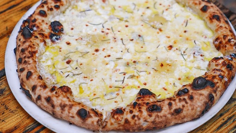 While some people can't imagine eating pizza without cheese, others can't envision the concept of pizza with no tomato sauce — yet both are classic pies. Pizza bianca (or white pizza) eliminates any chance of staining your clothes, which is already a bonus in our books. Clean wardrobe aside, the combination of warm, stretchy dough, cheese, and the occasional addition of garlic or a drizzle of olive oil is about as comforting as it gets. While mozzarella is a common topping, variations with Parmesan, burrata, and Alfredo sauce are all classified under the white pizza label.