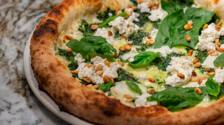 Spinach and ricotta pizzas tend to stick to a white base to avoid detracting from the delicate flavor of the ricotta. Creamy and mild in taste, this smooth cheese is a welcome change from saltier varieties. That being said, if you're used to heavily flavored cheese on your pizza, you might find ricotta a touch too subtle. Similarly, spinach doesn't have the tangy, salty, or earthy qualities of toppings like olives, mushrooms, or pepperoni.