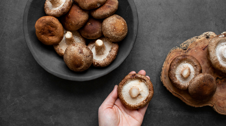 According to Food52, if your shiitake mushrooms are very fresh, you can actually just eat the stems by finely chopping them before cooking. Place at the Table suggests using the shiitake stems to make a rich mushroom broth that can be used to flavor gravies, pan sauces, risottos, soups, and stews, and recommends dehydrating the stems first in either a dehydrator or convention oven for even richer and bolder flavors. The stems will still be too tough to eat in this case, so you'll want to either strain the broth, or use a cheesecloth to wrap around the shiitake stems for easy removal and disposal, advises The Kitchn, which also notes that shiitake stems can be "frozen indefinitely," so feel free to save the stems and freeze them until you are ready to use them.