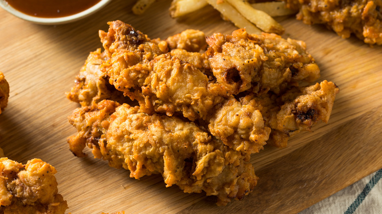 It is easy to recreate finger steaks at home. Food Network says the first step is to cut your steak into strips about 2 to 3 inches long. Make sure to remove the fat and skin. Separately, whisk together your batter. Seasonings can vary, but their recipe uses buttermilk, Worcestershire, salt, pepper, garlic powder, dry mustard, and paprika. Mix in a large bowl, and then coat the steak strips with the mixture. Then refrigerate the strips for a couple of hours. Allrecipes also recommends freezing them overnight. After that, coat the strips with seasoned flour and buttermilk, and repeat both until well covered. Once coated, it's time to deep fry to crispy perfection.