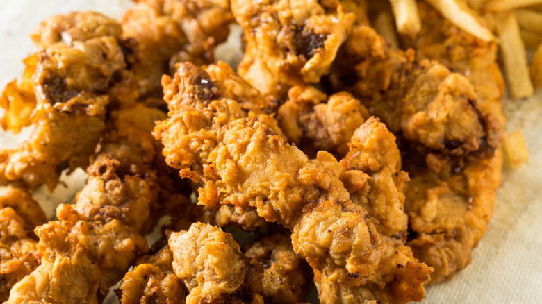 Finger steaks are what happens when country-fried steak and chicken fingers combine into one glorious finger food. They can be breaded or battered, and they get their name from being finger length, according to Olivia's Cuisine. They are also very seasoned simply with garlic powder, paprika, salt, and pepper. If not homemade, they can be commonly found in restaurants and bars across southern Idaho. The dish's popularity has spread to some surrounding states, but not outside the region. Olivia's Cuisine says, "[Idahoans] like to say they are the Northwest's answer to Southern fried chicken."