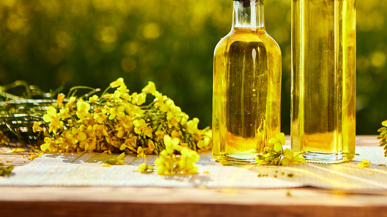 Time for another good seasoning oil you may already have in your kitchen — canola oil! This product is made from canola, a flowering plant that produces seed pods. The seed pods are harvested and crushed to release the oil.