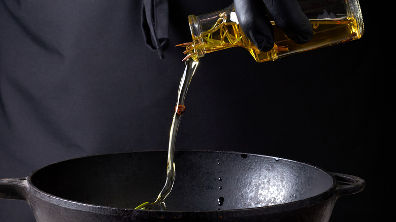 It's also good for your cast iron. Like most of the other oils in this article, safflower oil is a high smoke point oil at over 400 F, according to Canadian newspaper The Globe and The Mail. It has a neutral taste, making it useful for all kinds of cooking since it won't impart any additional flavor to your food from the coating. But it's important to store it the right way. Oxidation can cause safflower oil to turn rancid, so unopened bottles need to be kept away from light and heat (via VeryWell Fit). Once opened, it's best to store it in the refrigerator, where it will last for up to six months.