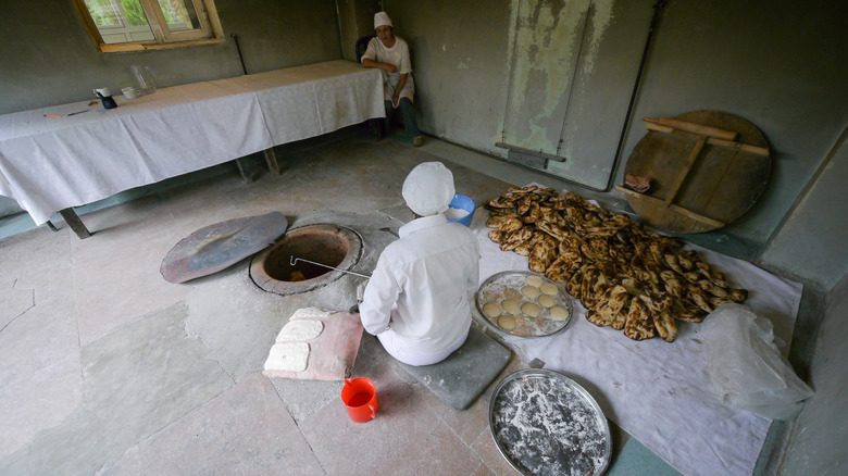 There wouldn't be lavash without the tonir — the large clay oven once the central heating in Armenian homes. Containing coals on the bottom and hot stones on the side, the tonir is now often housed in a separate building called a hatsatun, translated as a bread-house. While also used for roasting and boiling, the oven's most popular creation is always lavash, says Art-A-Tsolum. Let's dive into how the thin bread is made.