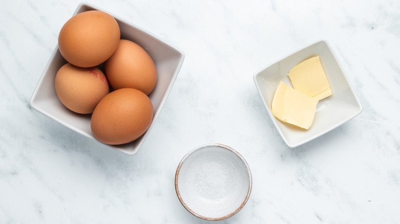 To make these scrambled eggs, you'll only need the eggs themselves, plus some salt for seasoning and a little bit of butter to cook them in. If this sounds a little plain for your taste, Brookes does say, "You could always add in a little of your favorite spices or herbs," or you could always try sprinkling some soy sauce into your beaten eggs.
