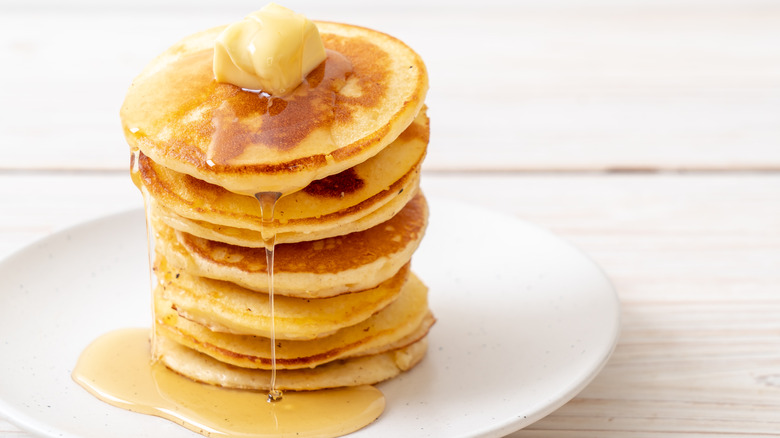 Now that you have the ingredients ready to make the perfect pancake batter, Serious Eats recommends swapping the milk with a cream liqueur, such as Baileys Irish Cream. By using the liqueur in the batter, the finished pancakes have a slightly nutty flavor. Per Serious Eats, don't worry about the pancakes tasting heavily of alcohol. Instead, they have more of a rich flavor. The recipe for Baileys pancakes on Wales Online describes the flapjacks with the addition of the liqueur as being soft and smelling great. The recipe calls for unsalted butter, salt, sugar, egg, milk, self-rising flour, and 80 ml of Baileys Irish Cream.