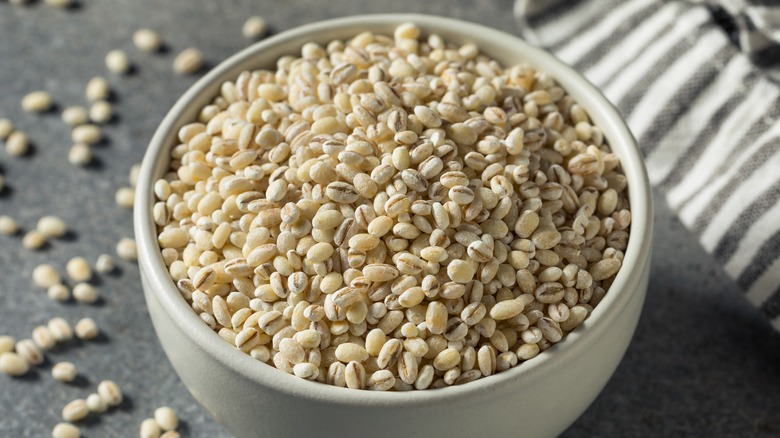 This is where the similarity to arborio rice comes in. MasterClass explains that pearl barley cooks at the same rate as arborio rice, making it ideal for orzotto. When cooking with pearl barley, as you would with risotto, make sure that whatever broth you are using is on hand and warm. The cold broth will shock the barley and may not absorb properly. The broth will release the starches in the barley, which is what imparts the orzotto with its creamy texture. Pearl barley is highly nutritious and has a neutral cereal taste, per Great British Chefs. So, swapping out your arborio for barley for your next risotto night won't just be healthier, but a little tastier too.