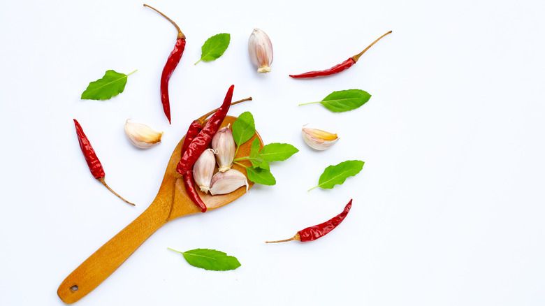 Thai cuisine heavily depends on chili and fresh herbs. Galangal, which is a rhizome that belongs to the ginger family, adds a peppered, ginger flavor that neutralizes the fish sauce in Thai dishes like tom kha kai, per Smithsonian Mag. Another fundamental aromatic in Thai stir fry is basil, holy basil, and Thai basil in particular. Both types of basil are crucial to Thai cooking, but they have different uses and flavors. Unlike the Genovese basil we usually find at the store, these types of basils become more fragrant when they're cooked. Your Indoor Herbs notes that holy basil has a stronger spice that adds peppery notes to Thai stir-fries, most commonly used in dishes like pad kee mao or drunken noodles. On the other hand, thai basil is used in Thai stews and curries because it is sweeter. Both are essential ingredients for Thai cooking, so make sure to load up on your aromatics before making Thai stir fry at home.