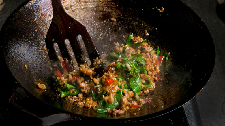 And yes, you read that correctly: Thai stir fries are relatively new inventions borrowed from Chinese stir fry techniques (via Indulge Bangkok). The introduction of the wok in Thai kitchens has opened the door to iconic Thai rice noodle dishes like pad thai, or spiced meats like pad krapow. These Thai stir-fries contain traditional Thai ingredients such as tamarind and fish sauce, but they also implement Chinese ingredients like oyster sauce and soy sauce. In the final product, these sauces are bound by the wok hei that envelopes the dish with a smoky fragrance. However, Thai stir-fries have a specific factor that distinguishes them from other one-pan medleys.