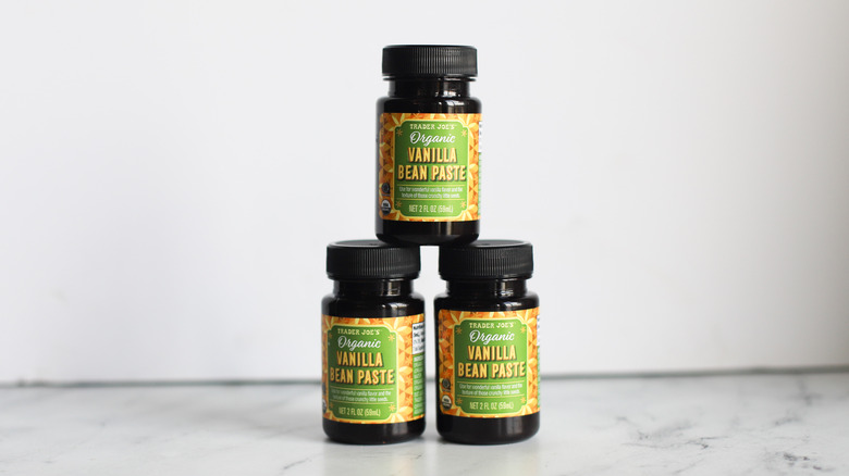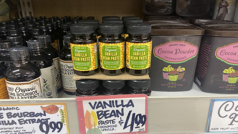 Wander around your local Trader Joe's, and you will probably find this product in the baking section, possibly near maple syrup and vanilla extract. As of October 2022, the cost for a bottle of vanilla bean paste is just $4.99 per 2-ounce bottle. Any serious baker knows that it's a steal at this price. Other brands like Nielsen-Massey charge as much as $18.95 (as of October 2022) for a 4-ounce bottle. That's almost double the price ounce-for-ounce.