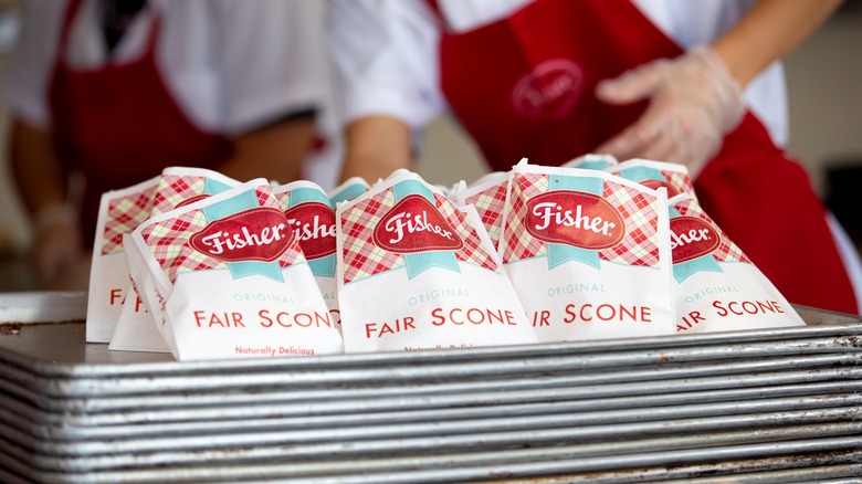 According to the company's site, Fisher scones have been served in Washington since the early 1900s. They were first served at the Washington State Fair, also known as the Puyallup Fair, named after the town that hosts it. It is one of the biggest fairs in the country, and the scones are wildly popular, with "one million sold annually over the course of the 20-day festivities" (via Food Network).