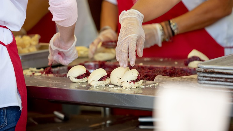 Fisher scones visually resemble a British Cornish or Devon scone, with red jam and cream oozing out the sides. The flaky, crumbly scones are served fresh and hot at Northwestern regional fairs, are often cut in half, and are slathered with whipped honey butter and succulent raspberry jam inside (via Food Network).