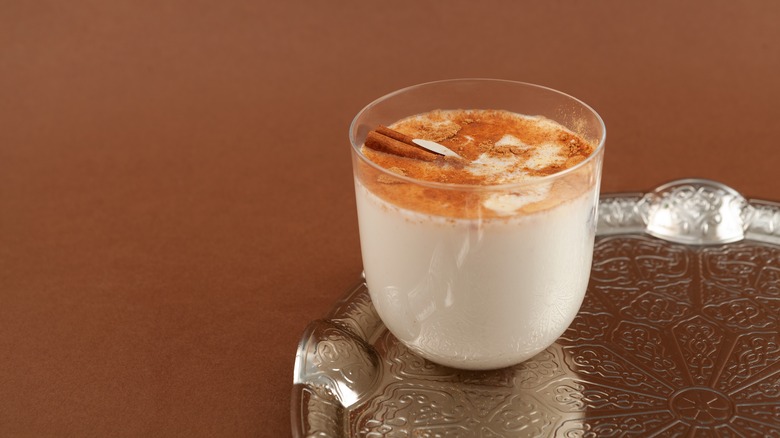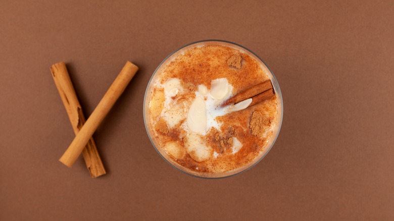 In 2021, mixologists Cristian Molina and Victor Illescas of Ai Fiori concocted a clarified milk punch with PSL flair (via Epicurious). Their extensive recipe involves adding hot milk to lemon and orange juices and leaving it for two days to curdle before assembling the cocktail. Their version is a combination of white rum and rye whiskey infused with vanilla bean, brewed coffee, pumpkin puree, lemon zest, orange zest, and a spice blend including clove, cinnamon, and ginger. Wine purveyor Skurnik offers a similar, more savory version made with steeped orange spice tea, an orange-and-lime muddle, pumpkin pie filling, and a bay leaf.