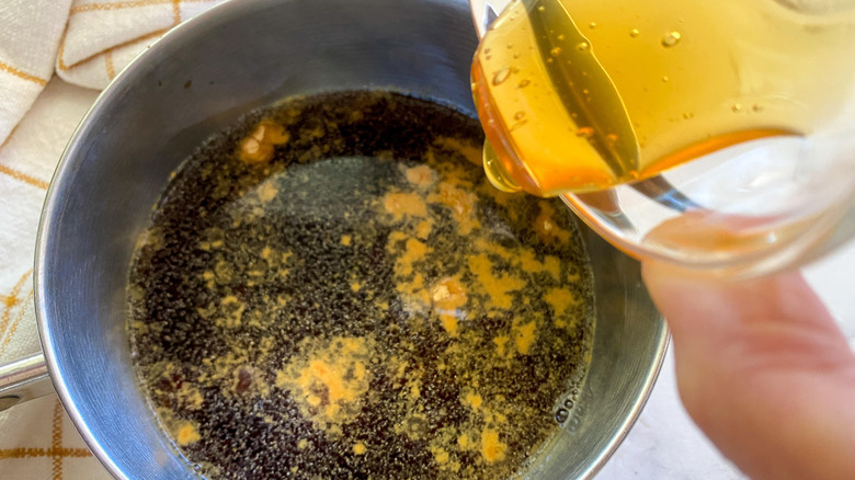 - In a small pot, combine ¾ cup of water, soy sauce, brown sugar, honey, garlic granules, and ginger. Cook on low heat for 5 minutes, stirring frequently to dissolve the sugar.