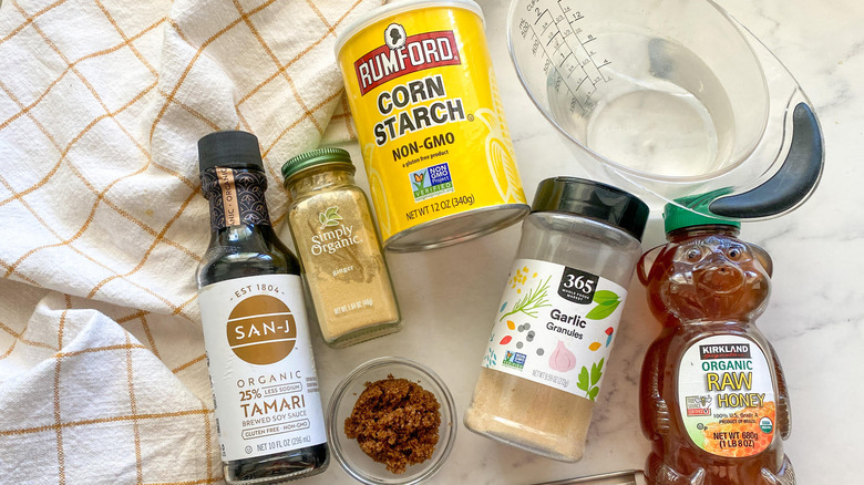 Kick things off by making a list and heading to the store. You will need water, soy sauce, brown sugar, honey, garlic granules, powdered ginger, and cornstarch. "If you have coconut sugar or date sugar, you can use those instead of brown sugar to add a more caramel flavor," Hahn notes. Another suggestion? "if you want to keep it low sugar, you can reduce sugar to 1 teaspoon, and if you want it vegan, you can use maple syrup instead of honey," Hahn shares.