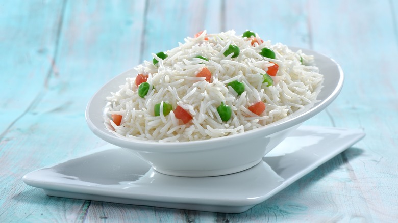 Originating in the Himalayas, India, and Pakistan, basmati rice comes in white and brown varieties and is typically used in pilaf, or as a side dish to soups and curries, states The Spruce Eats. With a subtle nutty flavor and scent of florals, this long-grain rice actually has extra-long, thin grains, which require further soaking before cooking to remove excess starches, compared to other types. According to Greatist, basmati has a firm, chewy, slightly drier texture.