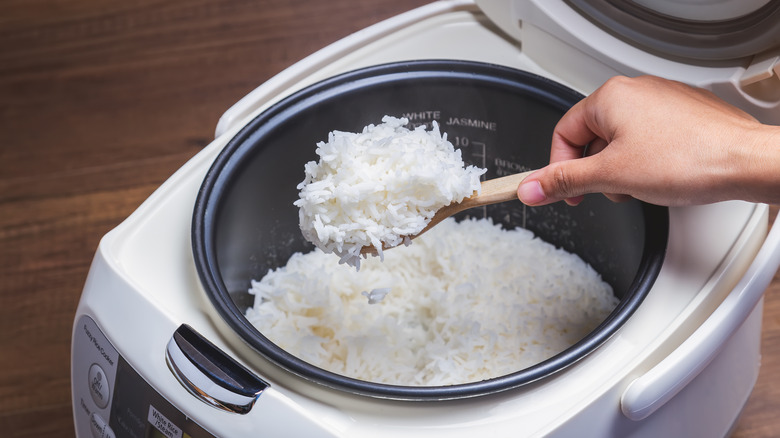 Known as "Thai fragrant rice," WebMD states that jasmine rice is a type of long-grain rice originating from Thailand, and comes in white, brown, red, purple, and black varieties, with white being most commonly produced. According to Fine Dining Lovers, jasmine rice is known for having a slightly sweet flavor and a subtle scent of popcorn. Its grains aren't quite as long as basmati rice, making jasmine's texture a bit more fluffy and light, and requiring less time soaking before cooking. This grain gets its name from its color, which closely resembles a jasmine flower. According to Greatist, jasmine rice is best steamed, compared to basmati's go-to method of boiling.